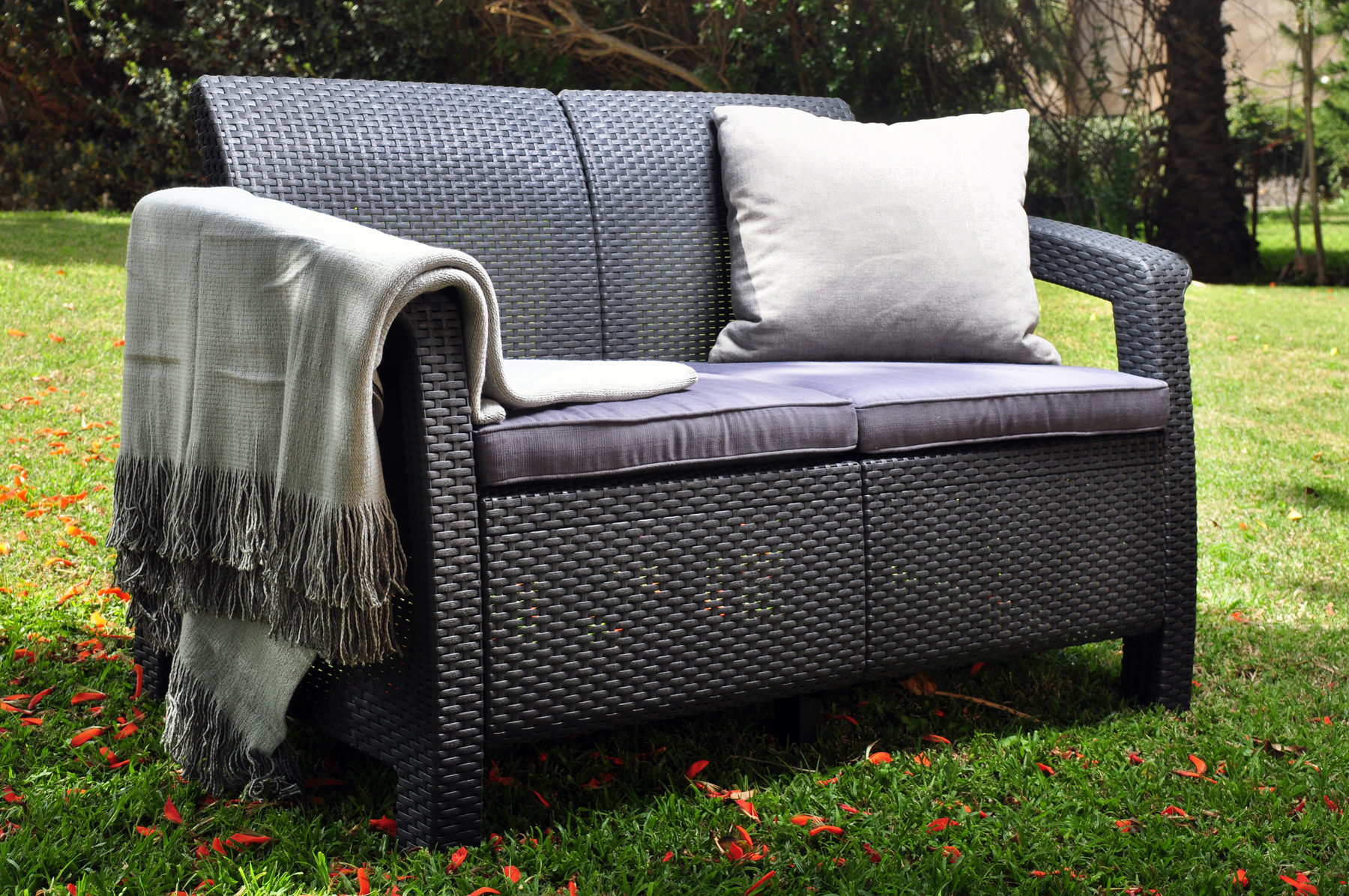 L-R: Keter Corfu Patio Love Seat, $128.24;: Sears; 7-Tier Bamboo Pyramids, $60.00: AsianIdeas.com